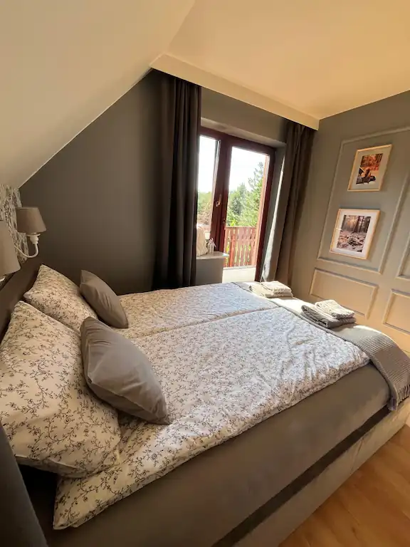 Jasny i przestronny pokój z dużym łóżkiem w domku Lawendowa Przystań w Brennie – idealny na relaksujący wypoczynek w górach